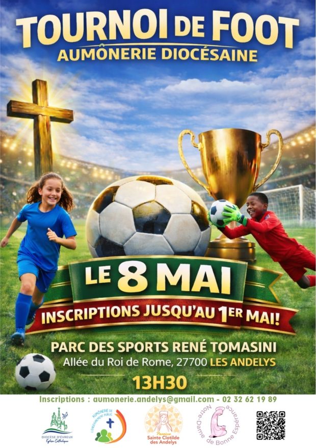 Plus d’informations et inscriptions sur le site du Diocèse d’Evreux : https://evreux.catholique.fr/evenement/tournoi-de-foot/